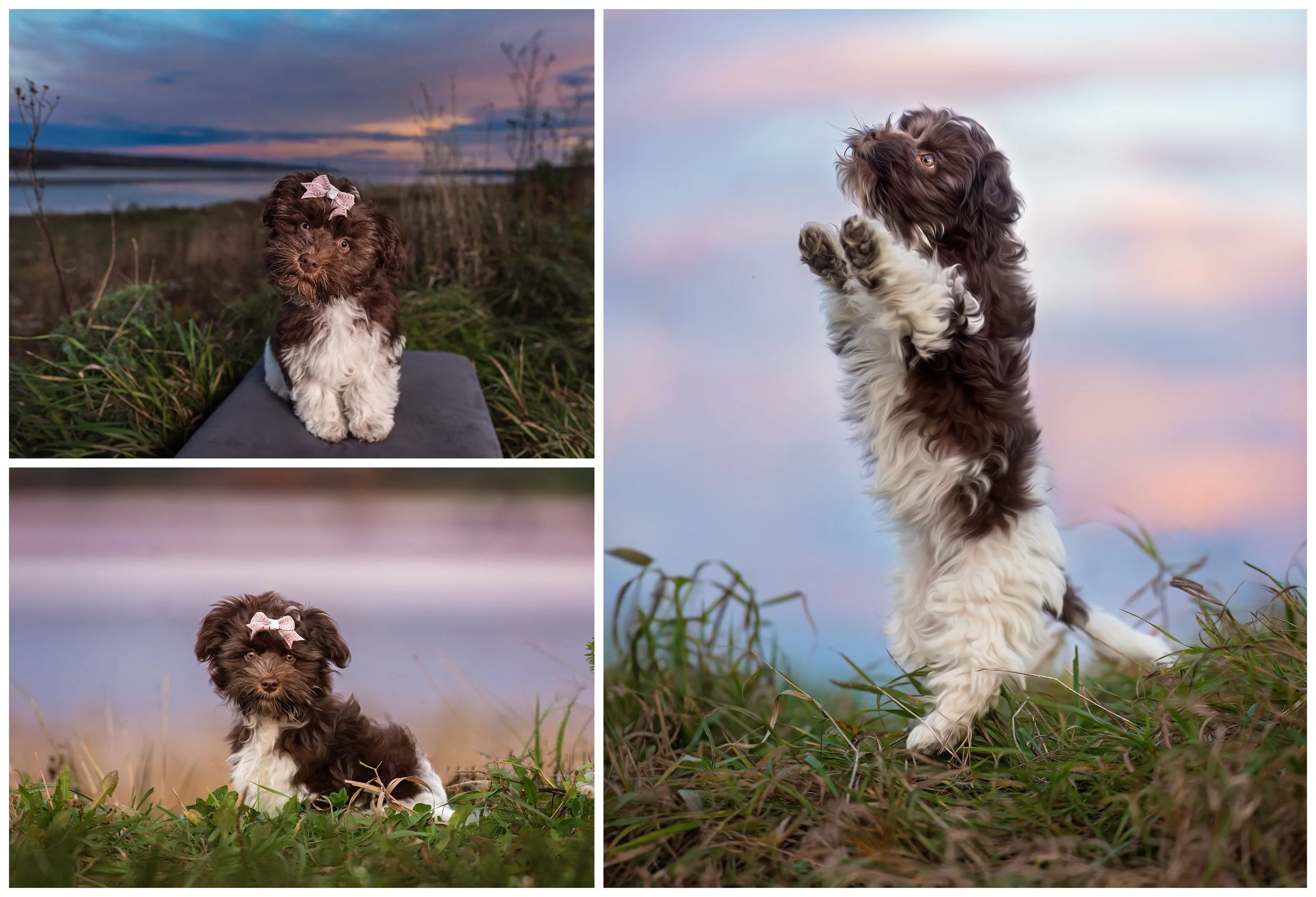 Confession time! Willow’s mom came prepared with bows, but Willow wasn’t very happy wearing them and kept pawing at them. In the end, I added bows using AI generation in Photoshop, which gave me the added advantage of being able to match the bows perfectly to the scene!